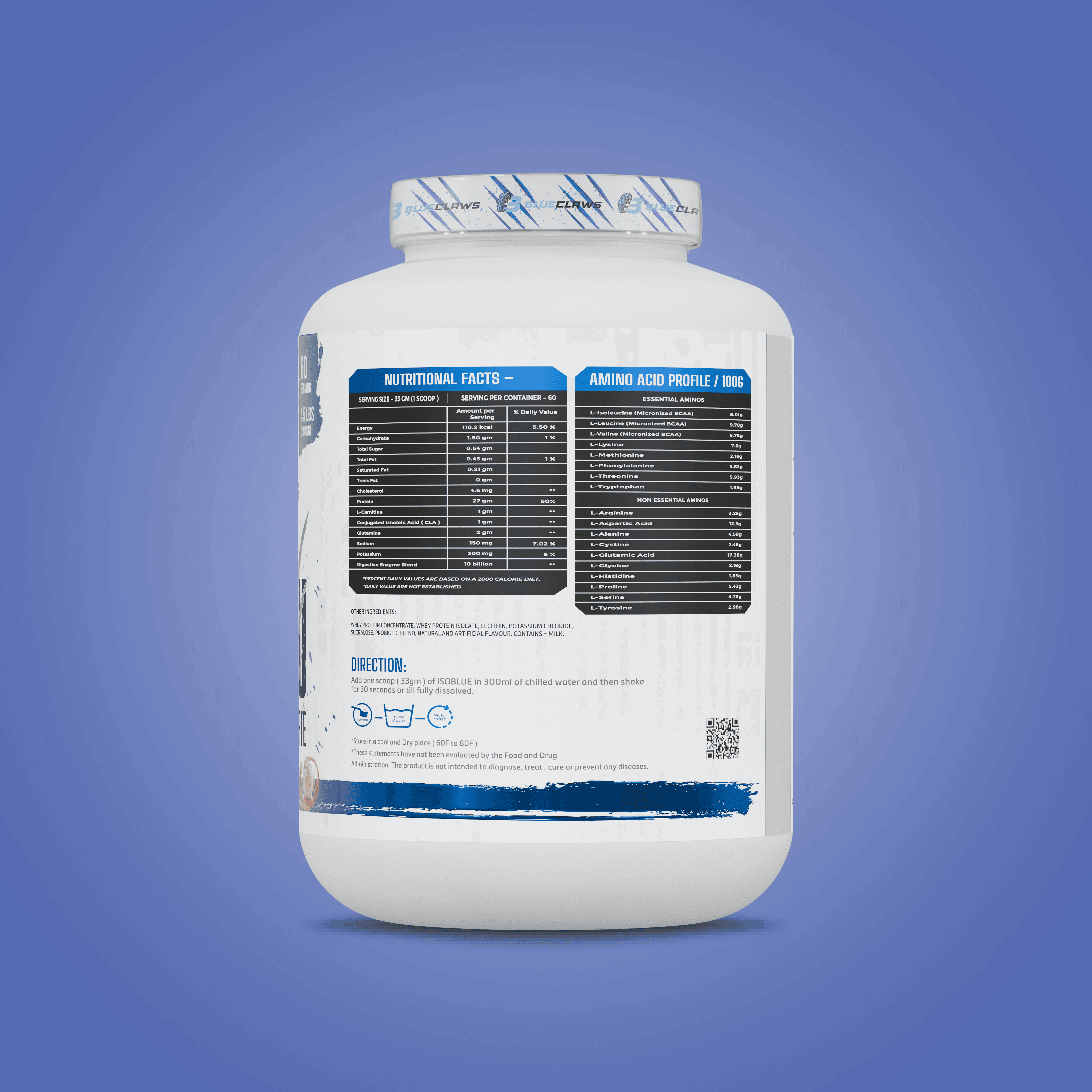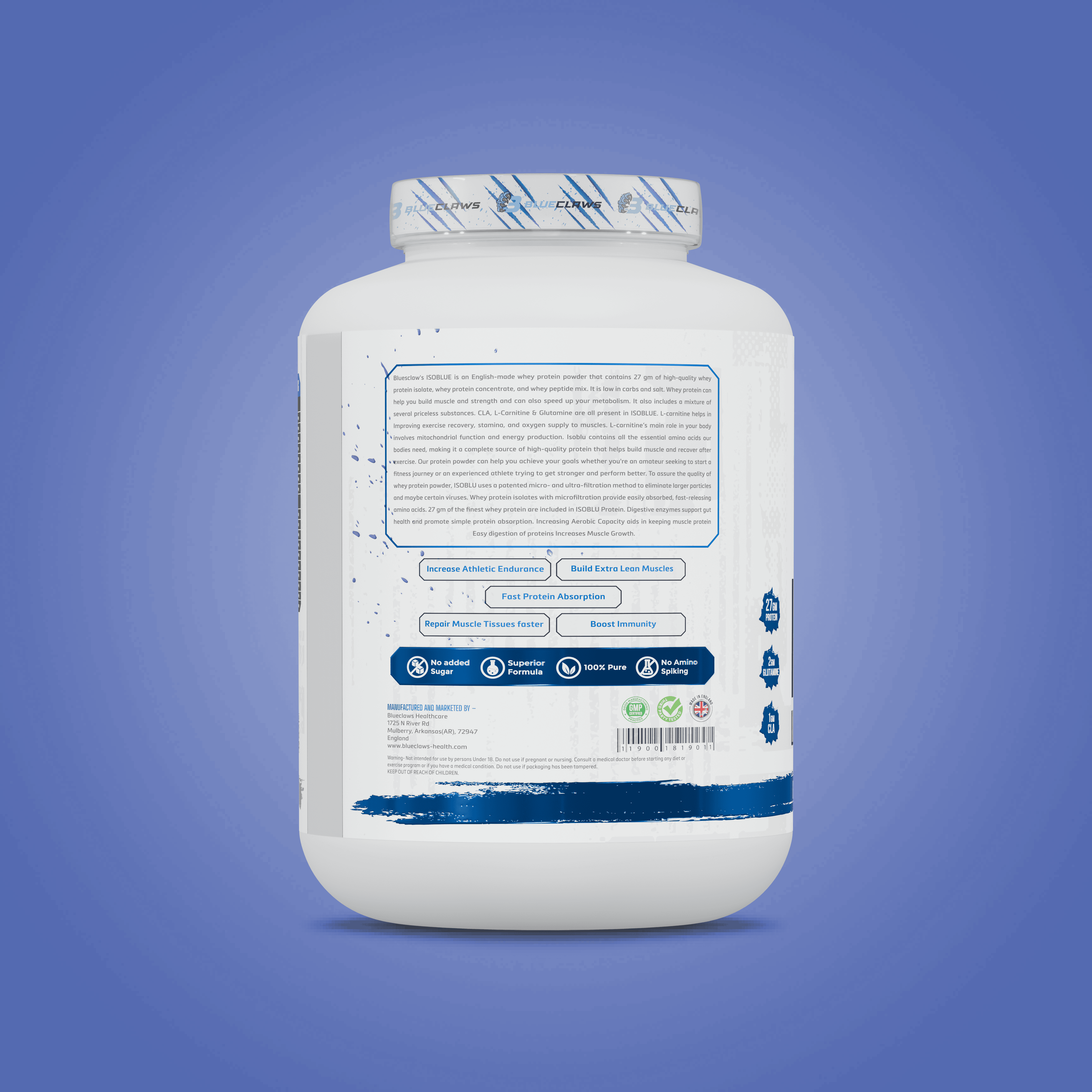 Bluesclaw's ISOBLUE is an English-made whey protein powder that contains 27 gm of high-quality whey protein isolate,whey protein concentrate, and whey pep de mix.It is low in carbs and salt.Whey protein can help you build muscle and strength and can also speed up your metabolism. It also includes a mixture of several priceless substances.Yohimbine,Cow Colostrum, Glutamine are all present in ISOBLUE. HMB facilitates quick healing and rebuilding of muscular ssue. A er consuming Isoblu for six weeks, an individual's strength and performance increase.Cow colostrum aids in boos ng immunity and lowering the risk of illness.Yohimbine increases endurance and aids in the body's removal of harmful lipids. Our protein powder can help you achieve your goals whether you're an amateur seeking to start a fitness journey or an experienced athlete trying to get stronger and perform better
